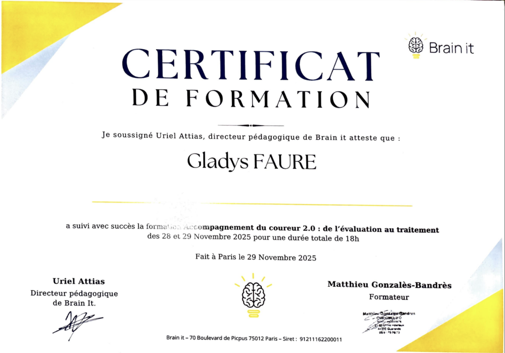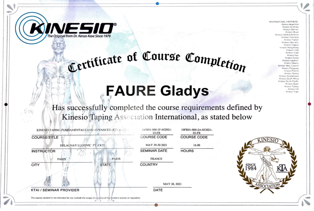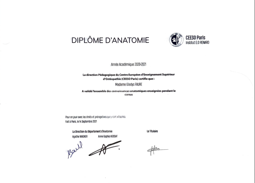 Gladys FAURE est diplômée du CEESO Paris, après 5 ans d’étude et 4600 heures de formation. Le CEESO Paris est une école agréée par le ministère de la santé et des sports.